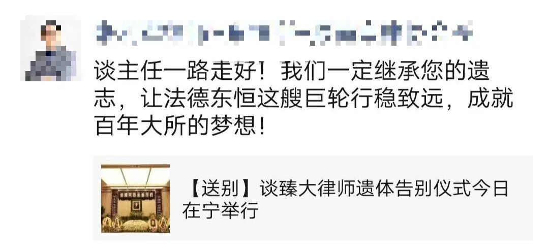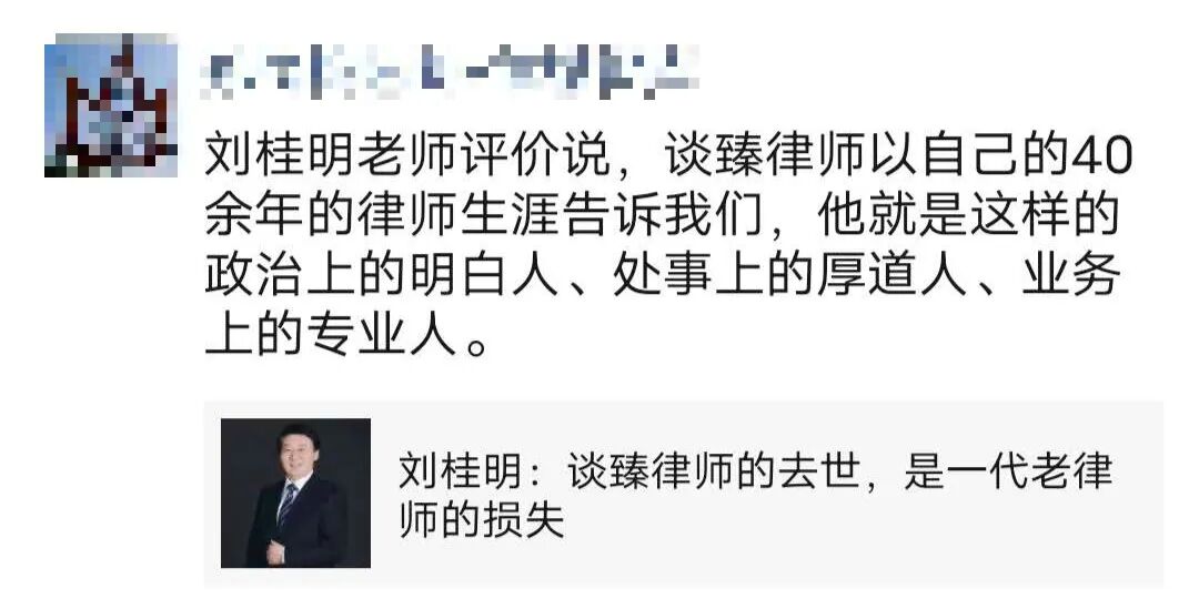 律新社了解到,谈臻律师去世后,先后有20多名律师深情写下纪念文章,回忆他的高风亮节和对培养年轻律师成长作出的贡献。“他在我心目中是‘大神’级人物!世事无常、长歌当哭,他的去世是中国一代老律师的损失!”与谈臻共事20年的律师庄卓在纪念文章中写道。