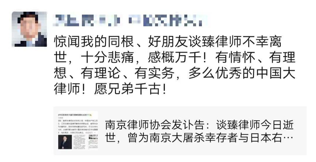 谈臻律师是谁?南京著名律师,生前担任江苏法德东恒律师事务所党委书记、荣誉主任,南京市法律援助协会基金会理事长,曾任南京律协党委副书记等职。今年6月12日6时许,他因突发肺栓塞抢救无效去世,享年66岁。其突然离世的消息,不仅在江苏乃至全国律师界引发了高度关注,各界人士纷纷以各种形式纪念、悼念他,还传播到了海外。