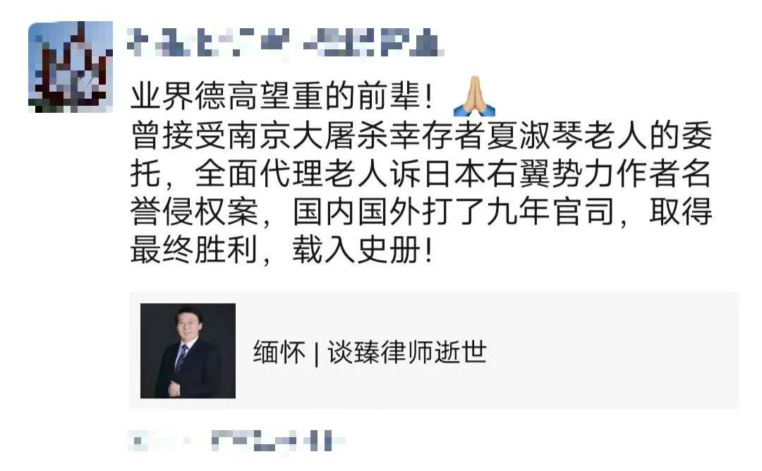 2009年2月5日,日本最高法院对夏淑琴名誉权案作出了终审裁定,这意味着夏淑琴老人名誉权案取得了国内法院、日本法院的全部胜诉。以谈臻为主的南京律师团队也由此载入了史册。