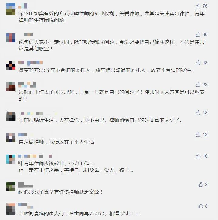 面对这一则则律师英年早逝的消息,每一位法律人都满怀悲戚。近日,上海律协公众号发表了一篇名为《生命不易,向日复一日默默耕耘的律师道一声晚安》的文章,文末有人留言到:“律师留给自己的时间真的太少了。”也有人感叹道:“自从做律师,我便放弃了个人生活。”