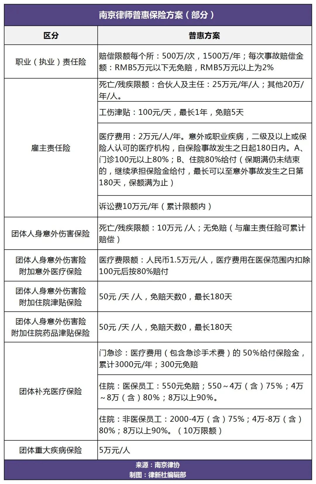 2006年6月20日,北京市律师协会与中国平安财产保险股份有限公司北京分公司达成协议,由中国平安财产保险股份有限公司北京分公司承保北京律师人身意外及健康保险。2013年,北京市律师协会与中国人民人寿保险股份有限公司签约,为会员提供人身意外及健康保险保障。根据保险内容显示,因疾病身故或全残的,可一次性获赔5万元,意外伤害身故、残疾、烧伤的,可一次性获赔40万元,意外伤害住院津贴100元/天。协议签署后,凡在北京市律师协会登记的律师因意外导致身故或残疾,均可从此保险中获得赔偿,极大地降低了律师的人身风险。凡在北京市律师协会登记的律师因意外导致身故、残疾以及遭受意外伤害事故并在医院进行治疗而支出的部分医疗费用,均可从此保险中获得赔偿,极大的保障了会员的权益。根据南京市律协七届六次理事会研究审议,决定为全体律师个人会员购买重大疾病保险,加强关爱律师民生工程建设。根据保险内容显示,合伙人及主任死亡/残疾,可获得赔偿25万/年/人,其他可获得20万/年/人。参保人员发生人身意外伤害导致死亡或残疾的,一人可获得10万元的赔偿。2010年7月,福州市律师协会与福建平安保险公司签订“福州市律师职业责任保险”和“福州市律师短期健康保险和意外伤害保险”协议,由律师协会从会费中拨出专项经费,统一为全市律师购买“律师职业责任保险”和“短期健康保险和意外伤害保险”。这是福州市律协建立律师职业责任保险机制、防范和化解律师执业风险、建立律师诚信制度、维护律师形象和声誉的重要举措。