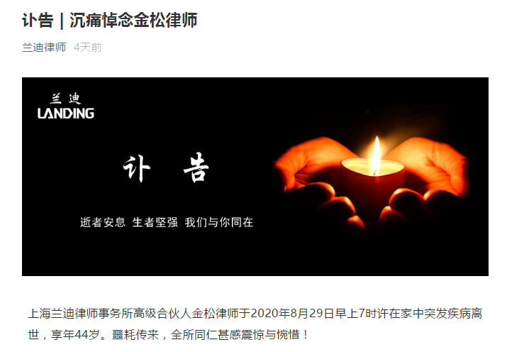 8月29日,上海兰迪律师事务所网站发布《讣告》称,上海兰迪律师事务所高级合伙人金松律师在家中突发疾病离世,享年44岁。律新社看到,好多律师在朋友圈沉痛悼念金松律师,对其去世的消息感到万分震惊和惋惜。更有律师提出:亟须解决律师及其他高压专业人士的健康干预机制。上海法治报、上海律协等法律公号也相继发文引导大家对年轻律师生存现状的关注和思考。此前的一项网络调查显示,在2231个投票律师中,只有16%的律师工作不超过8个小时,84%的律师工作超过8个小时,有18%的律师甚至每天工作超过12个小时。加班对律师来说成为了家常便饭,就连周末也有88%的律师仍要加班,并且一半以上的人周末加班时间超过4小时,并且有约10%的人周末加班超过12个小时,工作量巨大。