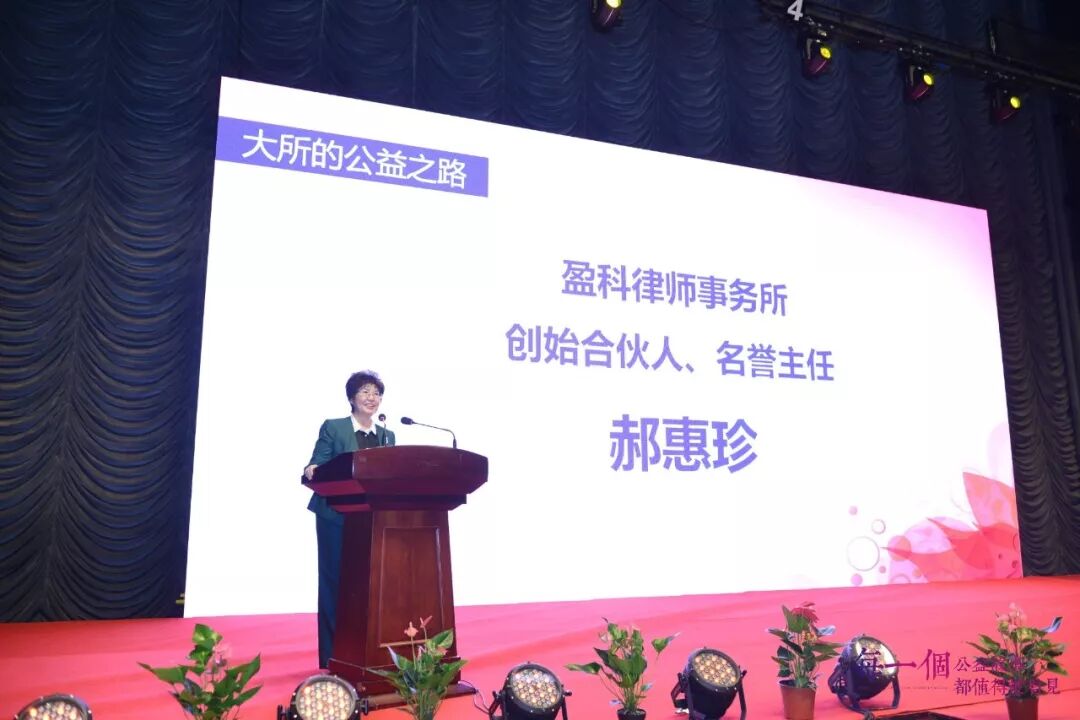 盈科律师事务所创始合伙人、名誉主任郝惠珍分享了对法律人做公益的思考和盈科律师事务所的公益经验。她表示,盈科自成立以来就坚持文化建设和诚信建设,把公益作为树立品牌、体现价值的重要路径,提出了走出去、走下去的目标。律所发展,既需要符合实际的商业运营,又需要有“仰望星空”的情怀,在创造经济价值的同时,更需要担起社会责任。未来,盈科人还将为行业搭建履行社会责任的桥梁,搭建公益法律服务与爱心资源对接的桥梁,推动和提升中国法律服务产业的普惠化进程,让更多人享受到法治的阳光。