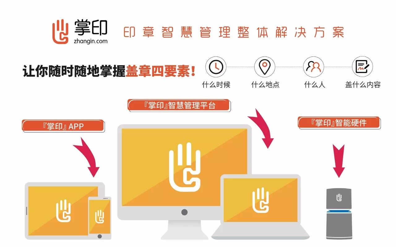 企业把实体印章装入掌印的智能硬件,成为一枚可以被互联网监管的智能印章,并结合印章管理平台进行移动式的申请审批流程操作。