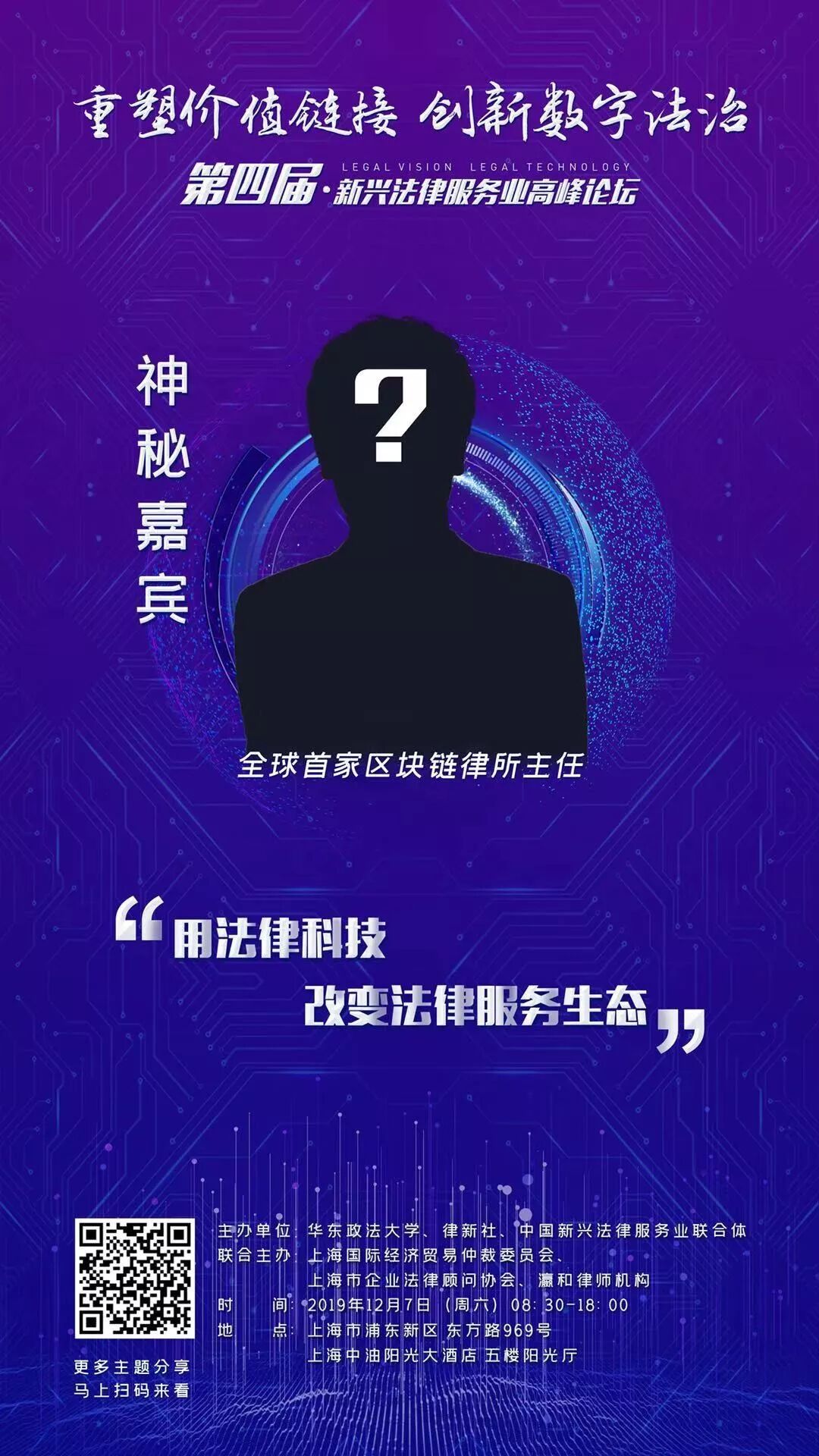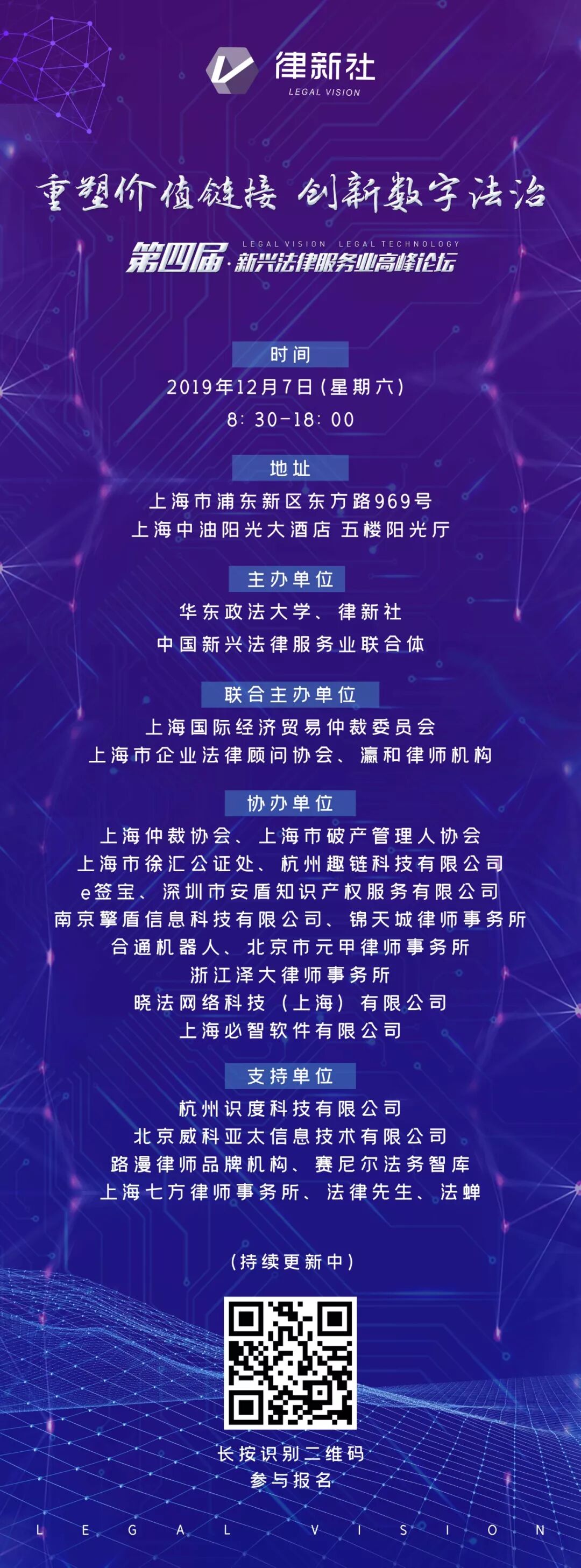 第四届新兴法律服务业高峰论坛议程 签到、参观展位、自由交流 华东政法大学副校长 陈晶莹 上海市司法局副局长 罗培新 上海国际仲裁中心副主任、秘书长 马屹 上海市律师协会会长 季诺 发布报告:2019中国新兴法律服务业发展报告 华东政法大学互联网+法律大数据平台常务副主任,华政中国新兴法律服务产业研究中心副主任 童潇 中国新兴法律服务联合体成员代表上台发布《中国新兴法律服务业联合体优化营商环境倡议书》暨签约企业组织仪式(律新社CEO 王凤梅等) 主旨发言: 公司制的黄昏:区块链如何重构商业世界?——中国区块链创业指导专家、中欧国际工商学院创业管理实践教授 龚焱 区块链技术推动司法治理的实践与探索——北京互联网法院副院长 佘贵清 中外企业法律服务智能化的机遇与挑战——走出去智库、合通机器人首席专家 吕立山 电子合同赋能企业法务信息化——e签宝高级法律科技专家 蒋璐明 中国区块链司法应用现状及趋势分析——杭州趣链科技有限公司存证溯源部产品总监 李晨熙 圆桌论坛 争议解决数字时代的挑战与机遇 主持人:律新社CEO 王凤梅 参与人: 上海国际仲裁中心副主任、秘书长 马屹 上海市律师协会会长 季诺 上海仲裁协会会长 俞卫锋 上海市破产管理人协会会长 刘正东 中国东方航空集团有限公司总法律顾问、中国东方航空股份有限公司法务总监、数据保护官 郭俊秀 论坛一 区块链+法律:用技术铭刻公平与正义 主持人:华东政法大学阳光与法治信访工作研究中心主任、纪检监察法学研究所副所长 虞浔 主旨演讲: