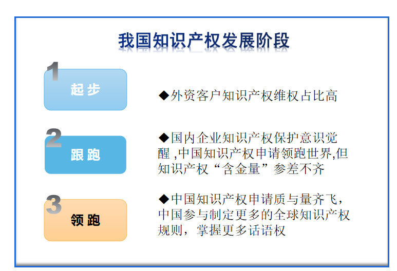 从起跑、跟跑到领跑作为行业老兵,丁华认为,我国知识产权的发展历经‘起步、跟跑、领跑’三个阶段,目前我们尚处于‘跟跑’阶段!
