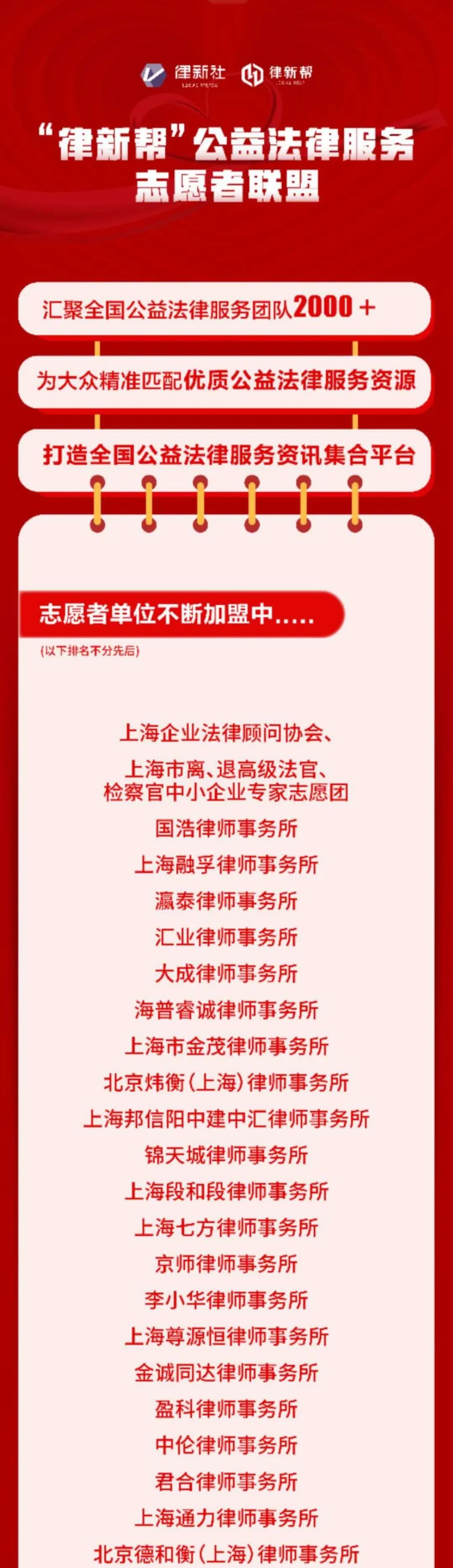 为了更好地将律界公益法律服务资源向社会公众推广,同时将三年中国律界公益榜单的优质公益服务项目落地,形成常态化服务效应,助力社会治理法治化,4月9日,律新帮公益法律服务志愿者联盟成立,律新社联合上海企业法律顾问协会,长三角企业法律顾问协会联盟,上海市离、退高级法官、检察官,中小企业专家志愿团以及多家律所律师志愿者、法律社会组织共同发起。