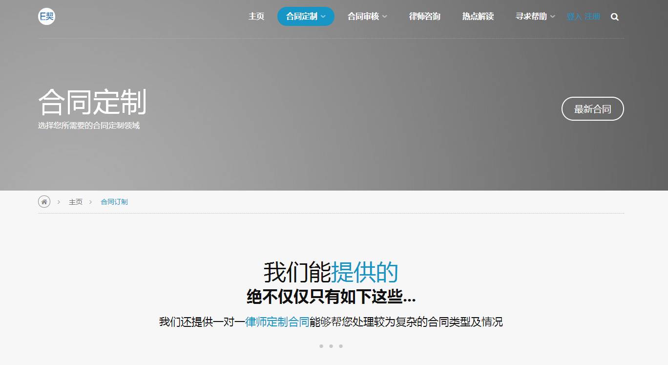 律新社在“E契”的主页上看到,目前的服务形式主要有“合同定制”和“合同审核”两大类,其中“合同定制”为免费产品,“合同审核”是收费产品。