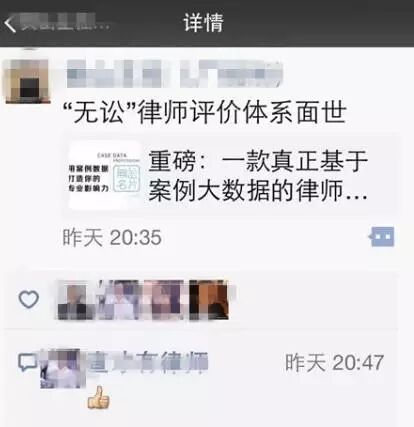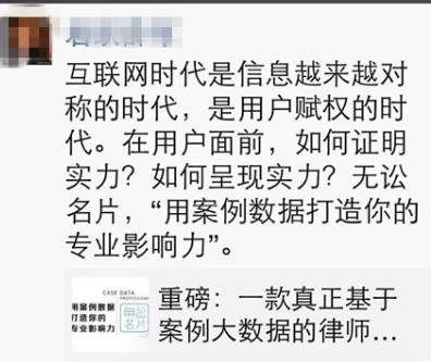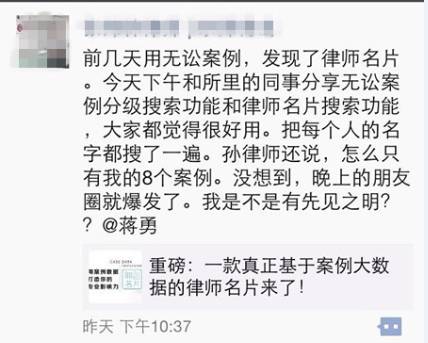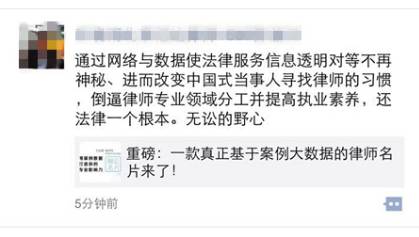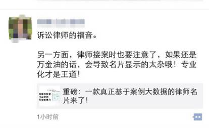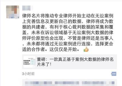 无讼律师名片上的信息均来自网络公开的裁判文书,所有的数据都是解构自无讼案例的数据信息。只要裁判文书有律师信息,均会被系统自动抓取,并按照逻辑重新整合排列。不过,这些数据主要以近两年的为主,过去的案例律师可以自己上传。律界反响:高度关注、看法不一“无讼名片”一经推出,便引发律师朋友圈的刷屏,这个现象本身已经说明这款产品精准地击中了律师的需求点。不少律师朋友分享了这一消息,并给予了积极评价,有人甚至认为其它的互联网法律服务项目可以停下来想想了。
