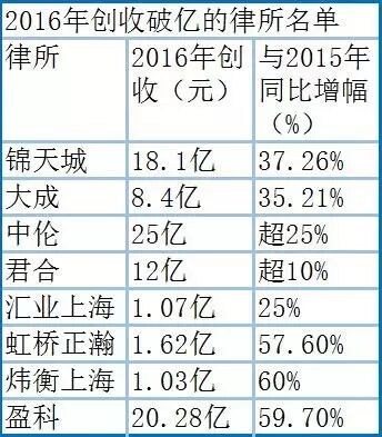 盈科、虹桥正瀚、炜衡上海去年创收增幅率超过或接近60%。炜衡上海所和汇业上海所跻身律界“亿元俱乐部”,律新社了解到,去年是汇业上海办公室创收首次突破亿元大关,真是可喜可贺。2016年盈科刚在清华大学新清华学堂庆祝了自己的15岁生日,收获了丰收的喜悦。去年盈科全年营业收入达到20.28亿元,全面完成了年初制定的“小目标”,同比2015年实现业务收入增长59.7%。盈科在既有的庞大体量基础上向前迈了一大步。