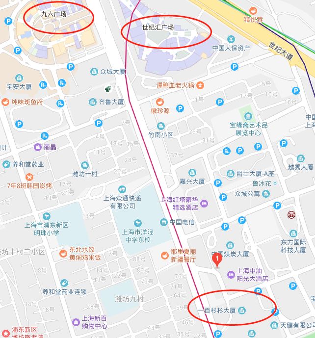 2.步行10分钟可到达“九六广场”“世纪汇广场”,各色美食应有尽有。(如下图)