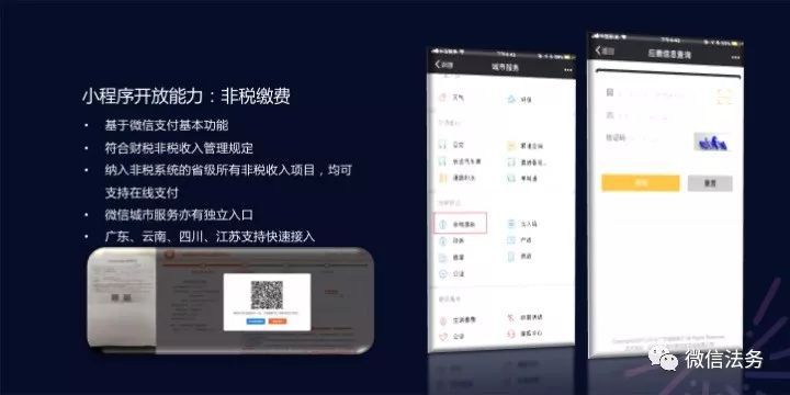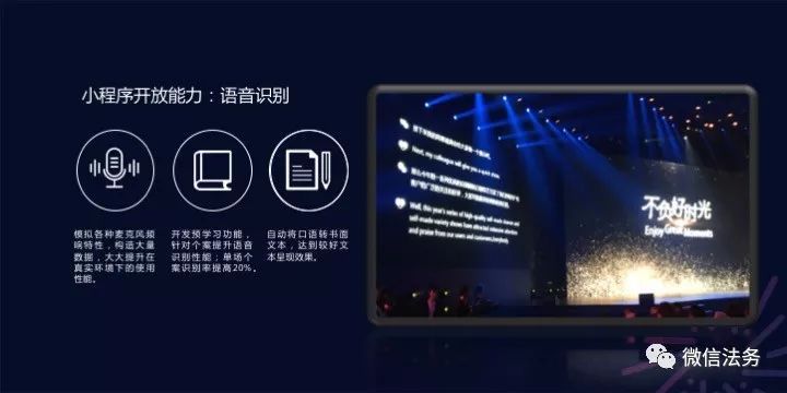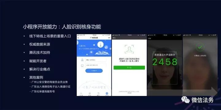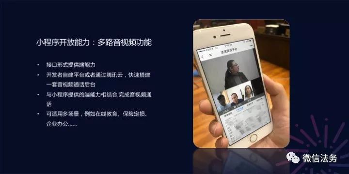 微信法务团队向律新社介绍,“微信加法”智慧司法开放平台是微信助力人民法院等司法机构信息化建设的服务平台,整合多项前沿技术能力,包括人脸识别身份验证、多路音视频通话功能、语音识别功能以及非税费用缴纳功能。