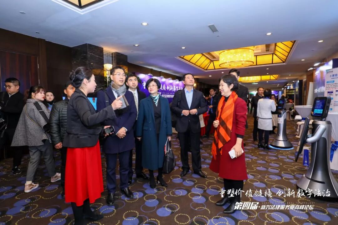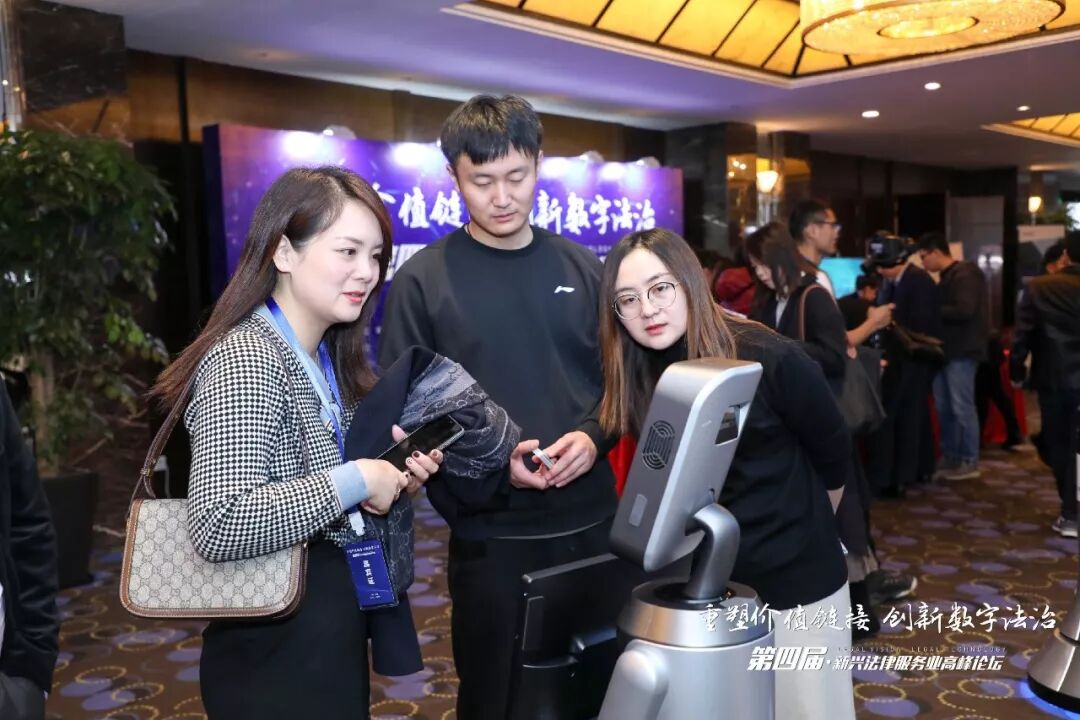 在主论坛正式开始前,就有嘉宾早早地来到现场体验最前沿的法律科技产品。本届论坛在场外设置了展位参观区,包括赛尼尔法务智库带来的“企业法律风险指数测评系统”,南京擎盾信息科技有限公司带来的“小法机器人”等,还有安盾网、北京元甲律师事务所、晓法网络科技(上海)有限公司、杭州识度科技有限公司、浙江泽大律师事务所、必智科技有限公司、路漫律师品牌机构、威科集团、合通机器人、瀛和律师机构等单位均设立了展台,吸引了许多来宾驻足观摩,现场气氛热烈。