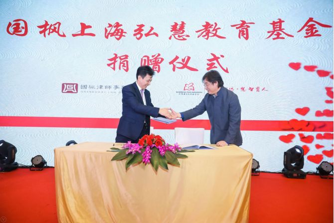 国枫律师事务所上海办公室管理合伙人、执行主任朱黎庭律师和弘慧基金会荣誉理事长孙麟先生作为双方代表共同签署《湖南省桑植县细砂坪学校国枫上海弘慧奖学金项目捐赠协议》。