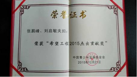 2015年末,“东方大律师”、上海中夏旭波律师事务所主任张鹏峰律师就和夫人刘启敏一起获得了中国青少年发展基金会颁发的“希望工程2015杰出贡献奖”,在一同受表彰的名单中,还有成龙、濮存昕等社会名人。