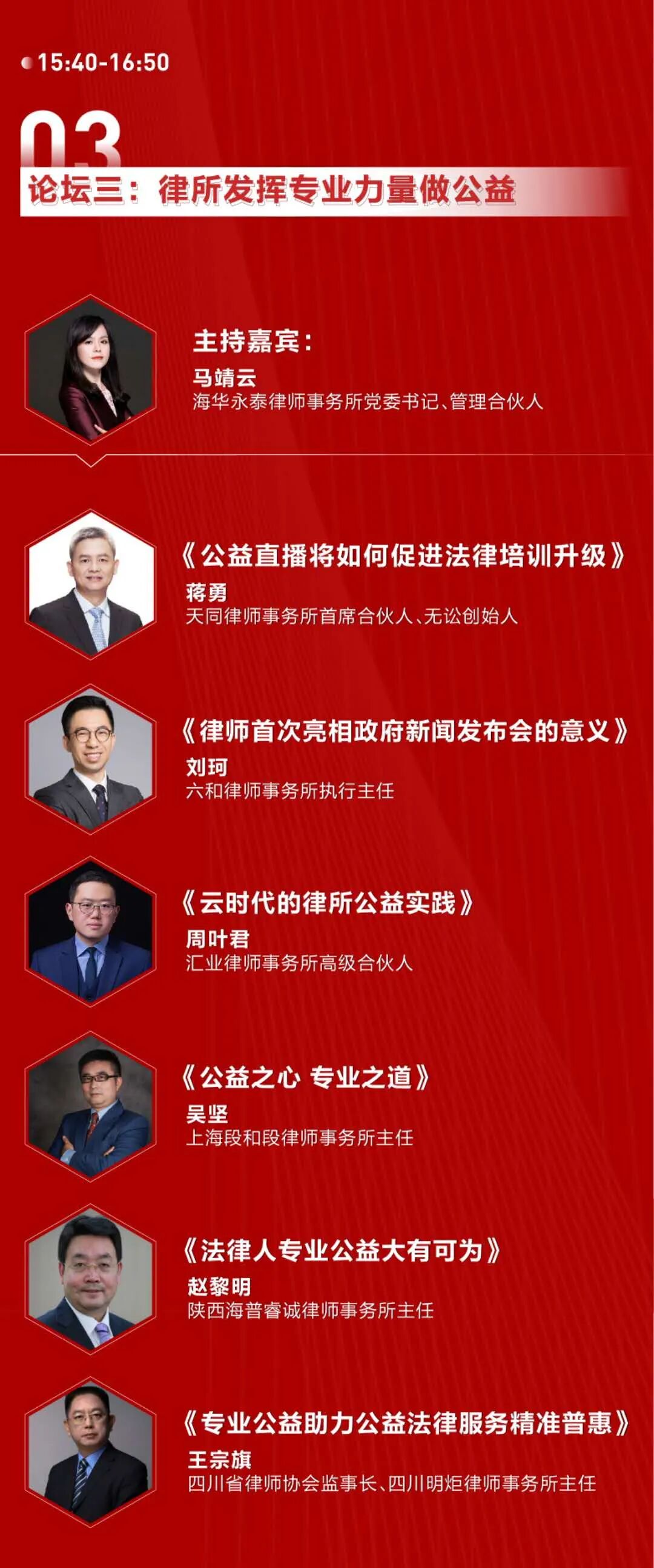 论坛三中,在海华永泰律师事务所党委书记、管理合伙人马靖云的主持下,各大律所相关负责人结合自身公益实践,对“律所发挥专业力量做公益”献智献策。
