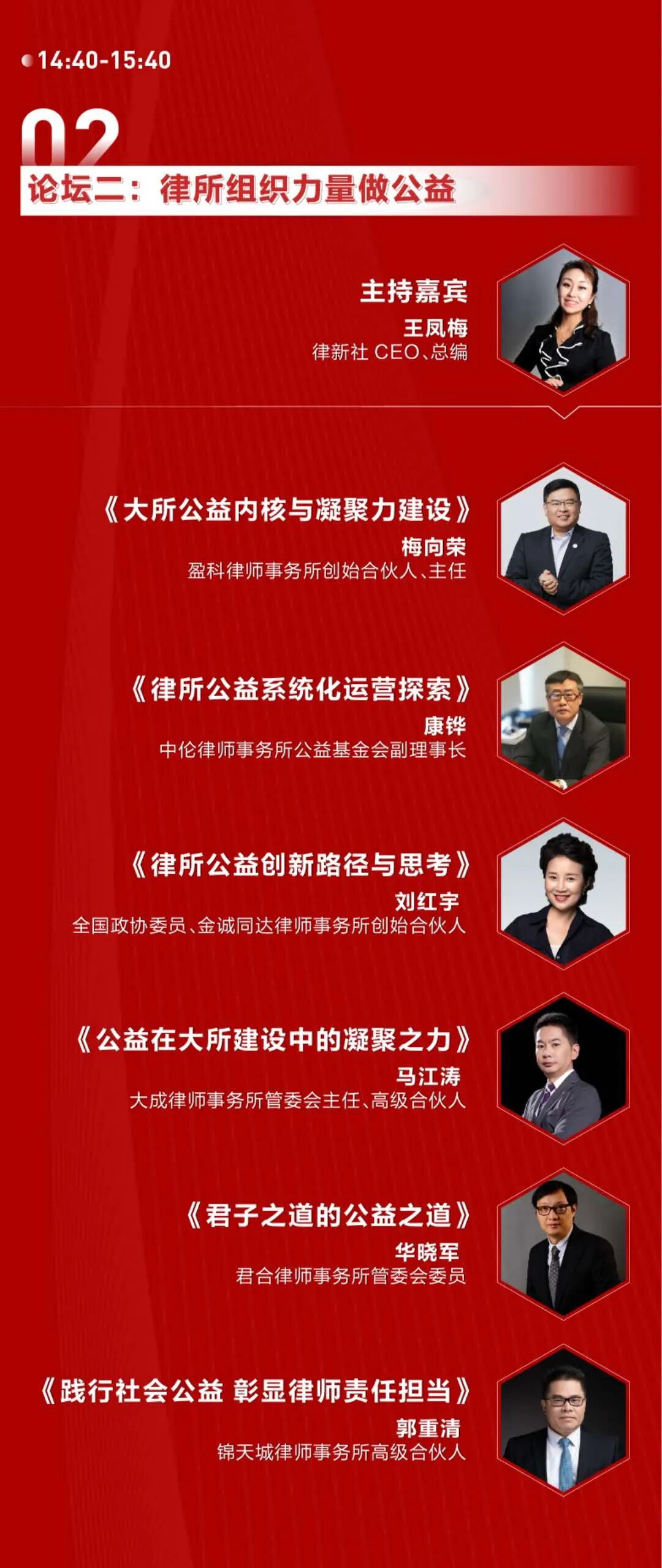 论坛二以“律所组织力量做公益”为议题,由律新社CEO 王凤梅主持。此次疫情中,很多大所发挥了组织效能,形成了巨大的公益合力。如何看待大所公益,来自中国大所的合伙人进行了分享。
