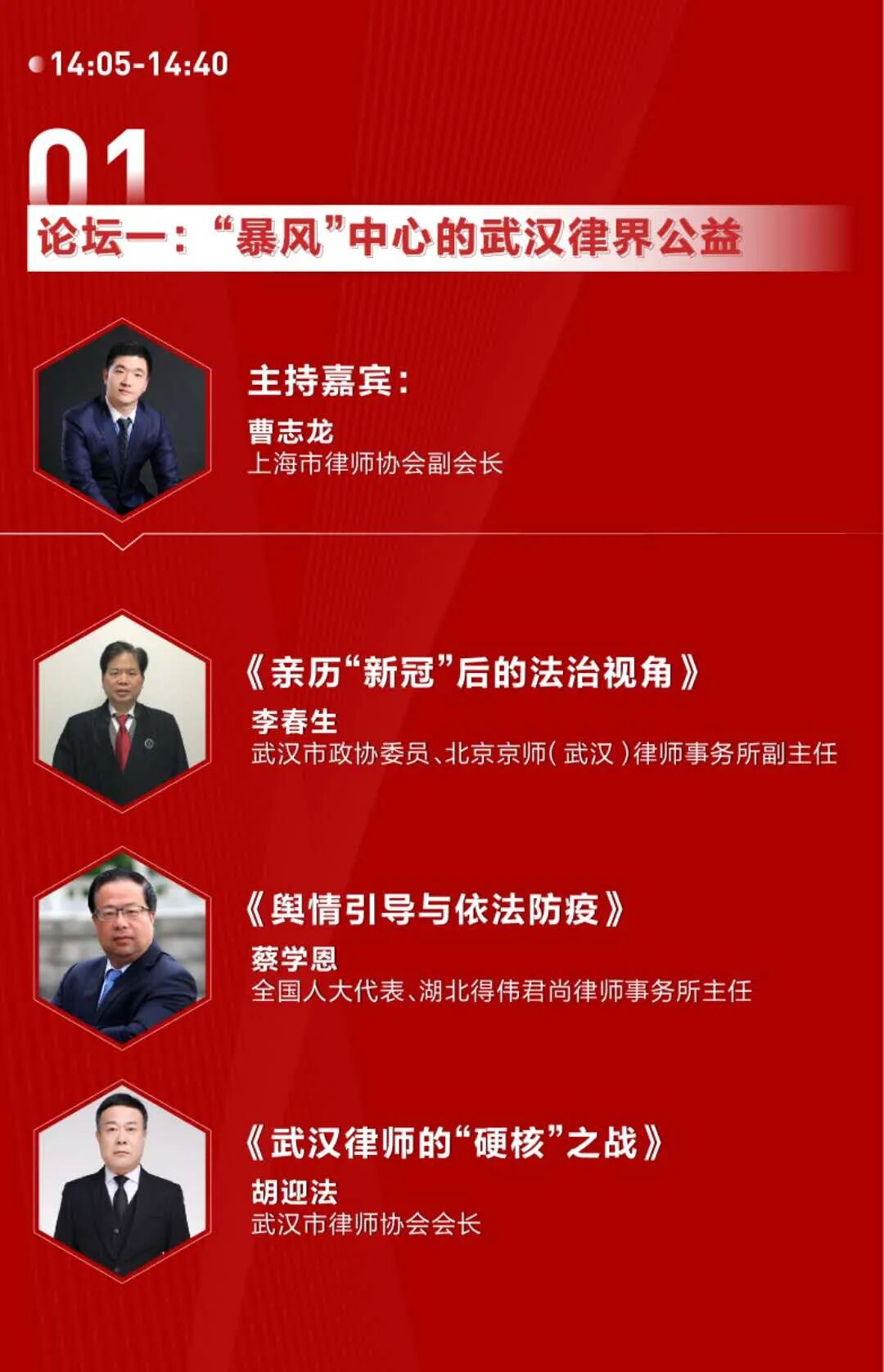 论坛一“‘暴风’中心的武汉律界公益”由上海市律师协会副会长曹志龙主持,他和来自武汉的律师嘉宾进行空中对话。