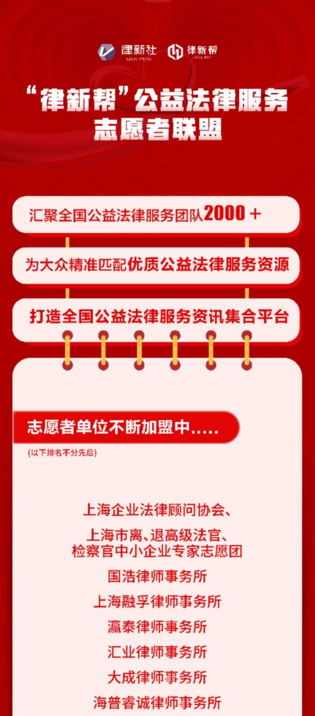 经过2个月的运营,“律新帮”推出“法佑天使”、中小企业复出援助讲座等多项公益服务活动。为了更好地将律界公益法律服务资源向社会公众推广,并将三年来中国律界公益榜单的优质公益服务项目落地,形成常态化服务效应,助力社会治理法治化,律新社发起成立“律新帮”志愿者联盟,旨在更好地将律界公益法律服务资源向社会公众推广,提供公益法律服务路径与时间,组织公益直播、公益普法等媒体活动,提供免费法律服务咨询,并将相关公益服务领域录入《2020中国公益法律服务指南》。