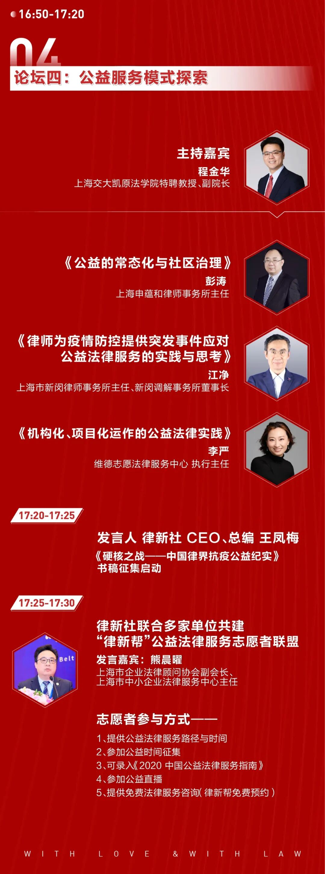 经此一疫,如何更好地通过法律服务参与社会治理、提高各项工作的法治化水平,成为中国律界公益法律服务的新课题,也是本次发布会的主题。本次论坛以“疫情下的律界公益责任与依法治理”为主题,分为四个分论坛,邀请多位一线大咖分享疫情期间的担当和思考。