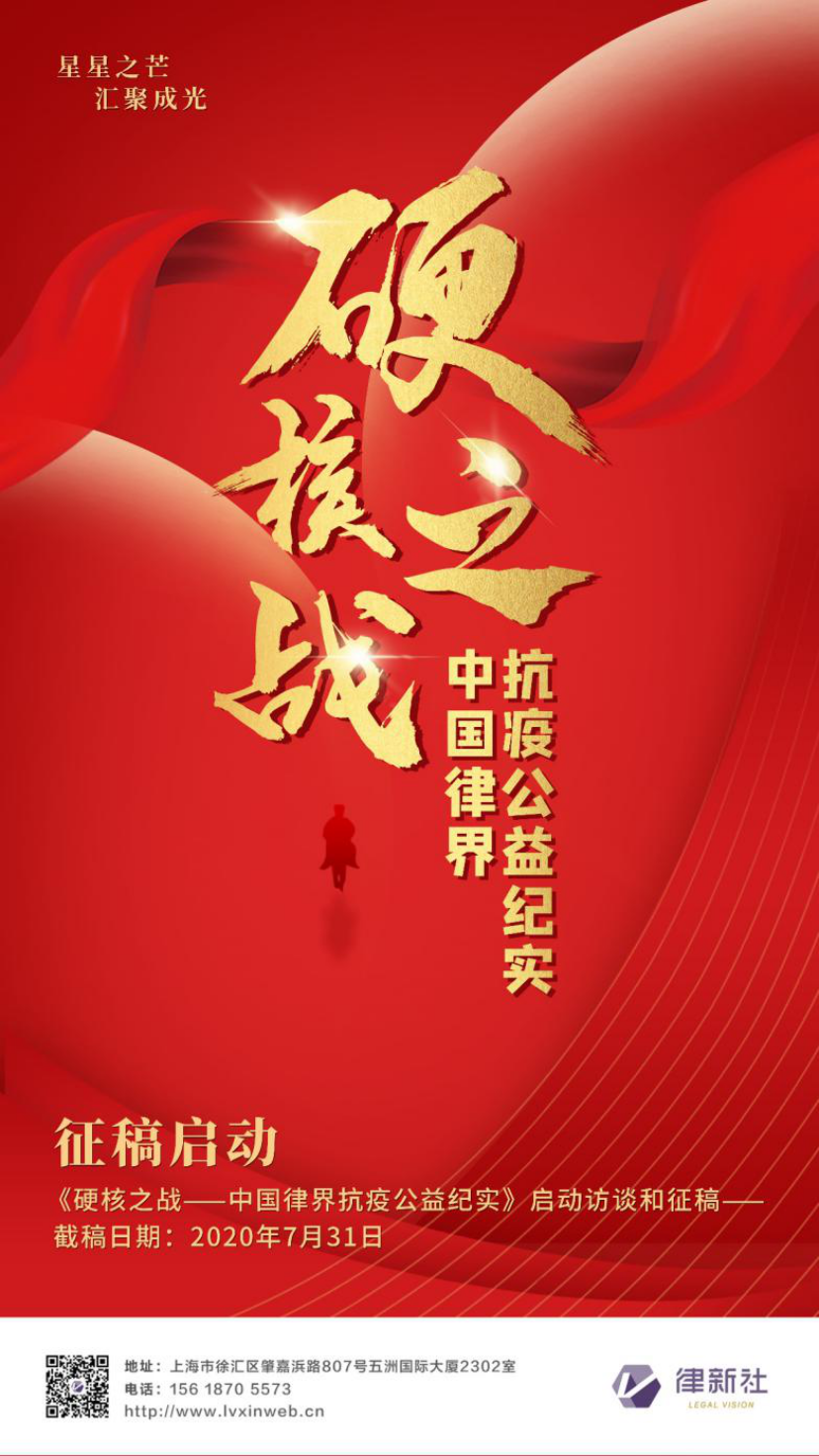 为了更好地记录和传承此次疫情下的中国法律公益文化和公益精神,留下历史印记,律新社特推出《硬核之战——中国律界抗疫公益纪实》出版计划,收集记录此次疫情中的各类公益之举,展现律界的公益担当。截稿时间为2020年7月底,计划2020年10月出版。
