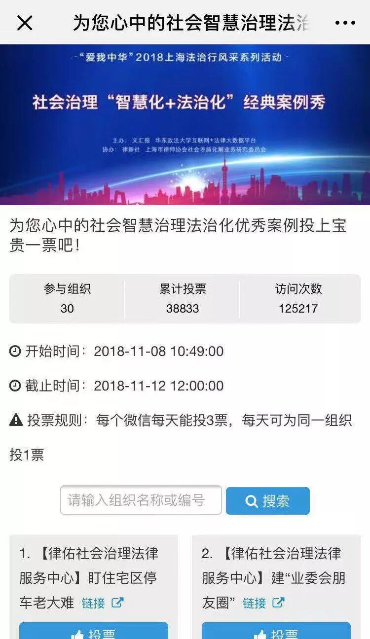 由文汇报社、华东政法大学互联网+法律大数据平台主办,上海市律师协会社会矛盾化解业务研究委员会与律新社协办的“‘爱我中华’2018上海法治行风采系列活动 社会治理“智慧化+法治化”经典案例秀”征集活动于自10月12日全面启动后,引起业内积极关注,沪上数百家法治类社会组织投送了近千份精彩的社会治理案例。