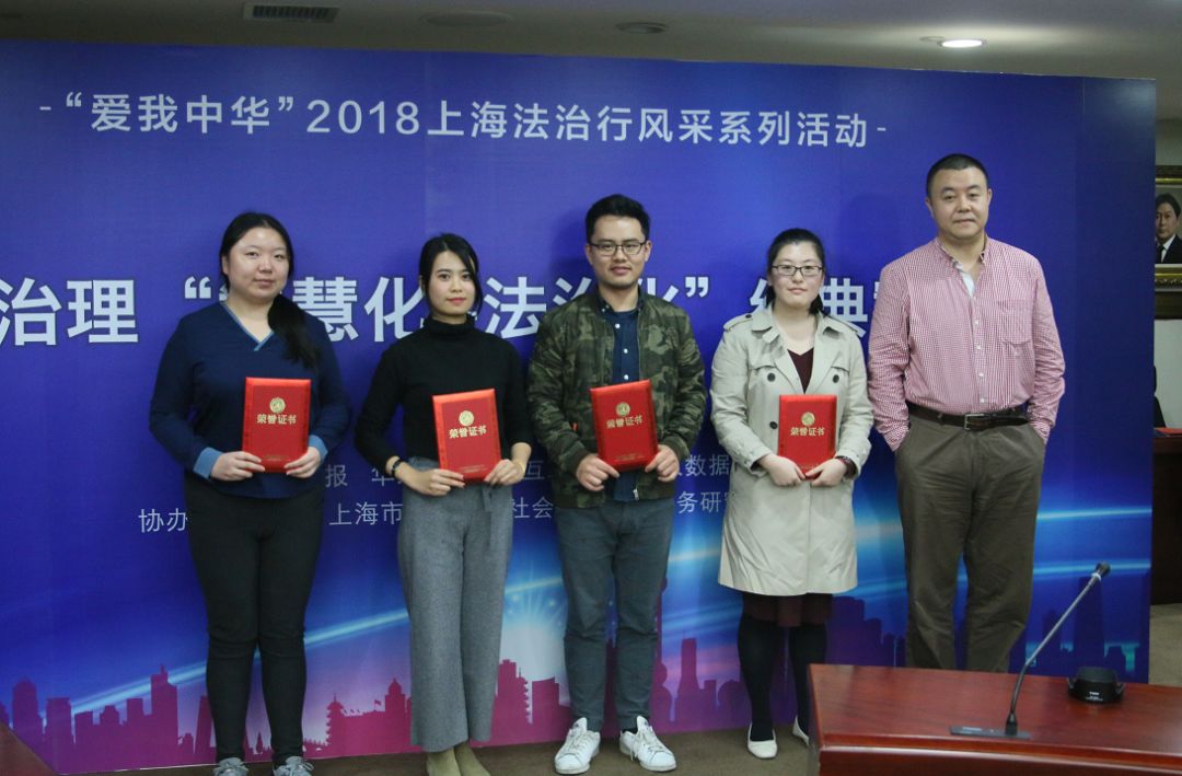 华东政法大学“互联网+法律”大数据平台常务副主任童潇、上海市社会建设研究会副会长方士雄、上海市委政法委研究室主任徐礼强、律新社总编、CEO王凤梅及文汇报经管办副主任毛依栋分别向获得荣誉称号的社会组织代表颁发了证书,用这样的方式向他们的工作成绩表示肯定。