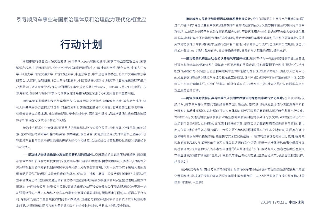 会上,论坛与会专家学者联合发布了《引导顺风车事业与国家治理体系和治理能力现代化相适应珠海行动计划》(以下简称《珠海行动计划》)。律新社在现场了解到,此次发布的《珠海行动计划》从四个维度,积极引导顺风车与国家治理体系相适应,并计划2020年推出社会各界公认的顺风车平台安全服务团体标准。