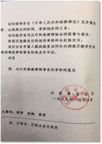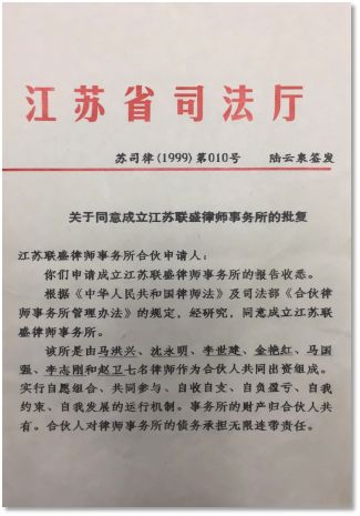 1999年1月13日省司法厅批准江苏联盛律师事务所成立