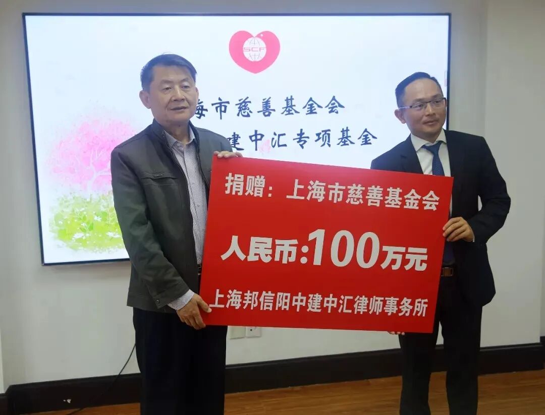 2019年5月,上海市慈善基金会邦信阳中建中汇专项基金举行捐赠签约仪式,该专项基金由邦信阳中建中汇向上海市慈善基金会捐款人民币100万元设立,将致力于包括贫困地区教育扶持、优秀师资力量培养、青年学生激励等有意义的慈善项目和公益事业。从创所之初,邦信阳中建中汇始终坚持“公益乃一种常行”的理念,将公益作为从始至终的使命与追求,并持之以恒地坚守和行动。