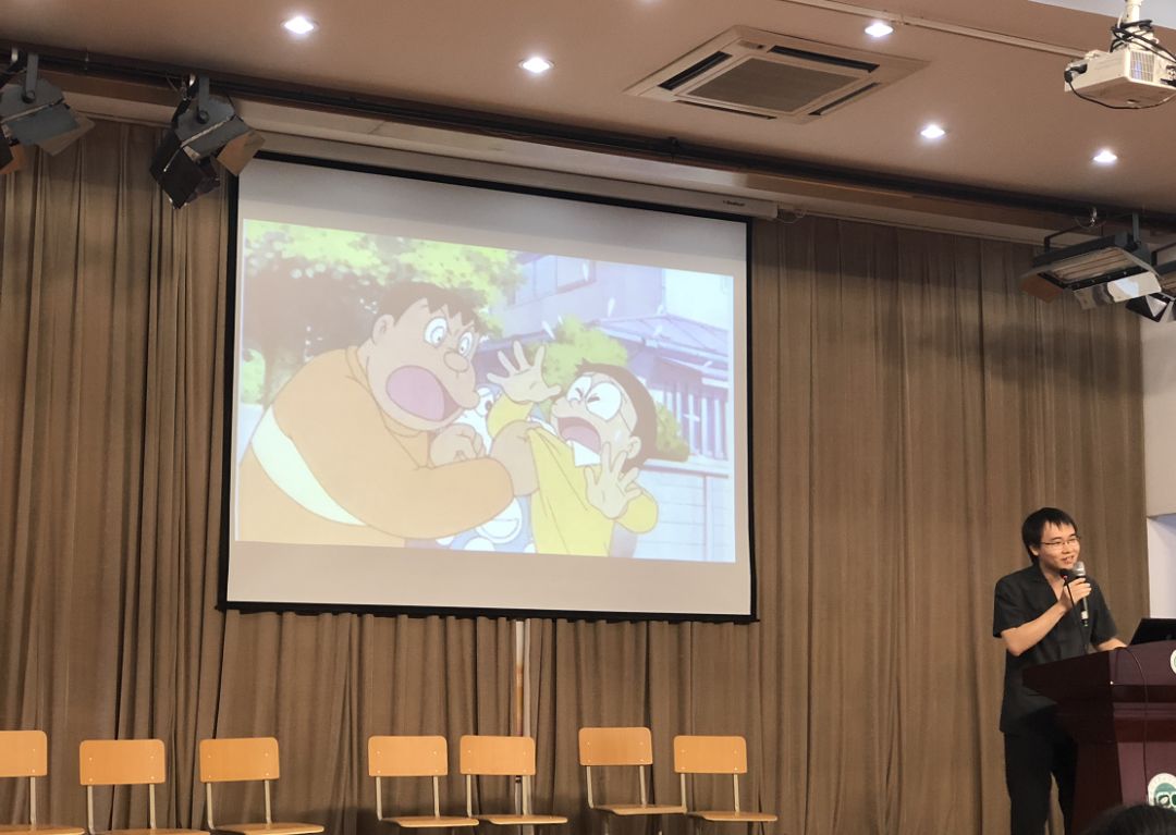 王梓焱一边播放电影《恐龙》片段,一边向120名初中预备班学生介绍校园欺凌对被害人心灵造成的影响,同学们目不转睛地听着。