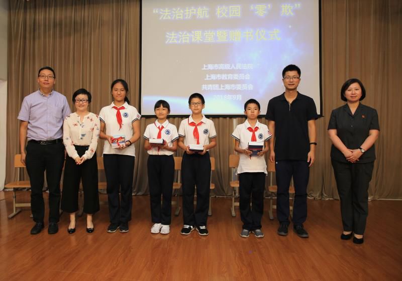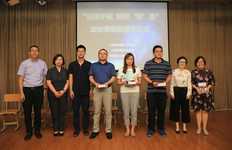 40分钟的法制课结束后,赠书仪式正式开始,上海高院等4家主办单位负责人分别向学校师生代表赠送了《法治护航校园“零”欺》专题普法读本。