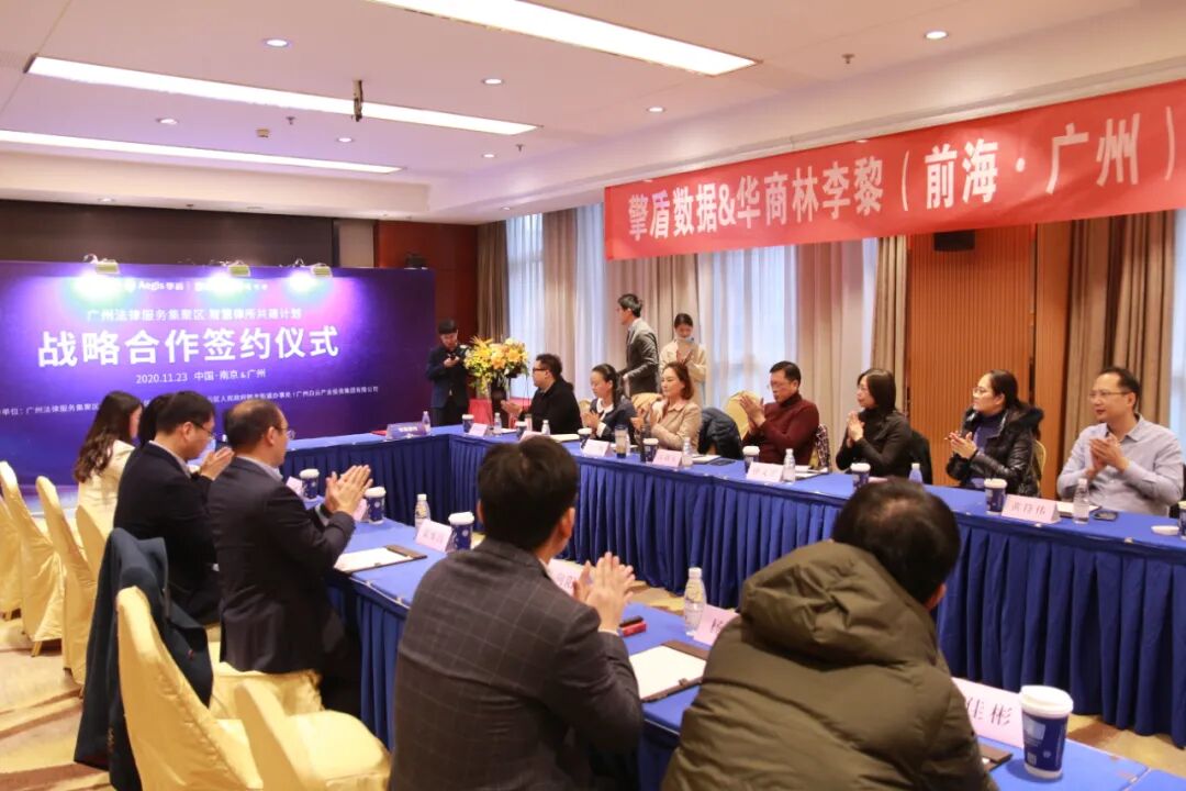 在战略合作签约仪式现场,来自擎盾、华商林李黎所、广州市白云区司法局、广州市白云区鹤龙街道、白云产投集团的领导与专业人士共聚一堂,共同探讨法律人工智能的应用前景与智慧数字化律所建设。