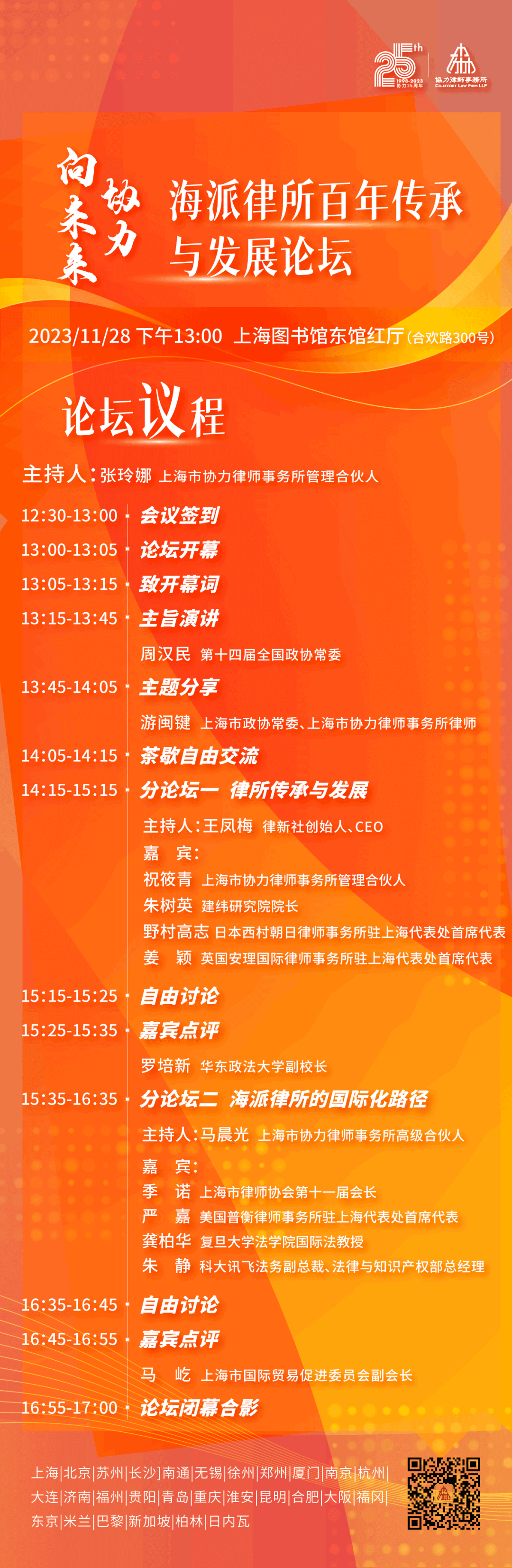 过去、现在、未来,每一秒共同组成“时间”。在名为“时间”的这条泛泛之河里,中国律师制度经历了四十余载风雨浮沉。四十余载大浪淘尽,岁月熔金,中国法律服务市场逐渐发展成为如今的模样。 站在二十世纪的末尾,上海市协力律师事务所而今已25岁。假使以百年律所为目标,协力已行至四分之一。秉持专业,精益求精,25年里协力以专业为中国法治发展持续贡献力量。 “国无常强,无常弱,奉法者强则国强,奉法者弱则国弱。”如今,我们国家和社会的法律体系已经基本形成,总体上实现了有法可依,律师队伍也已经成为全面依法治国一支不可或缺的重要力量,这是所有法律人共同取得的成就,也是我们继续奋斗的契机。 2023年转瞬即逝,面对复杂的形势与挑战,着眼当前国内法律服务市场格局,立足健康长远的法律服务市场环境,我们思考着如何迎接时代变局中的挑战?如何更好地传承、创新、发展?如何保持持久的品牌力与竞争力? 鉴于此,我们诚邀律界翘楚、行业代表、著名学者,从多行业、多角度进行深入讨论,为海派律所传承与发展提供新思路、新观点与新指引,共同探讨律师事务所持久发展之道。 我们将于2023年11月28日下午13:00,在上海图书馆东馆红厅(合欢路300号)举办“协力向未来——海派律所传承与发展论坛”,欢迎您的参与!