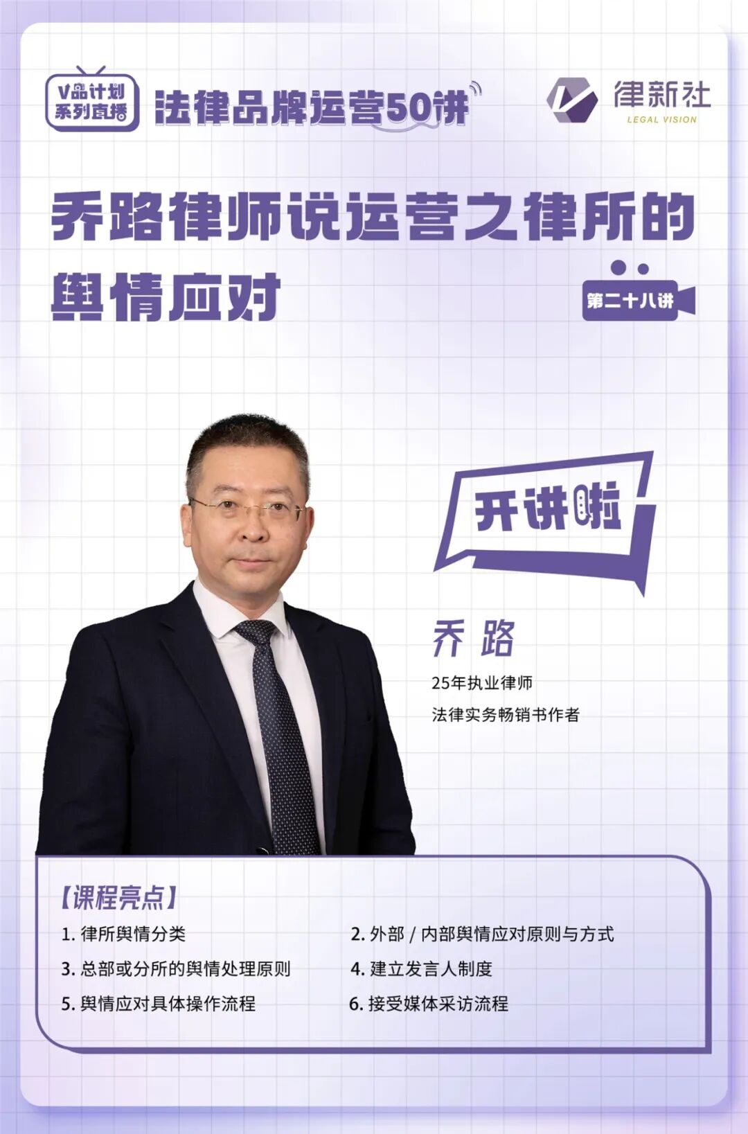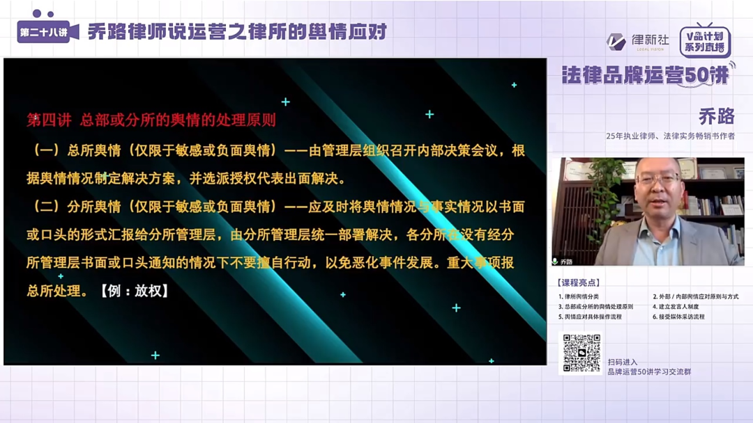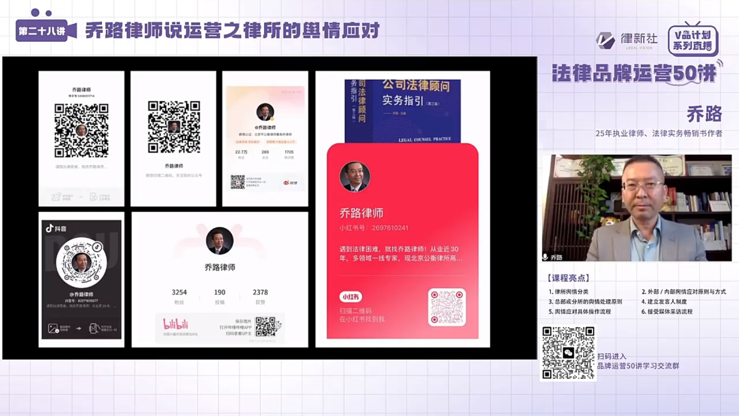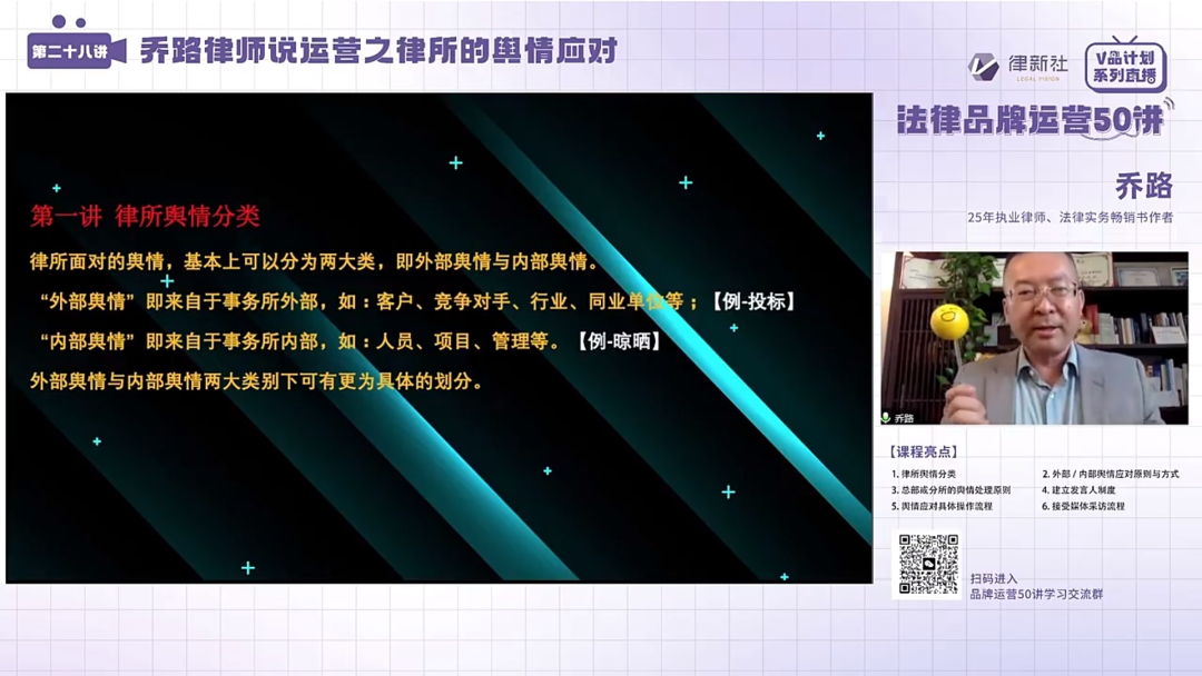 律新社“V品计划——法律品牌运营50讲”系列直播第二十八讲,邀请到中国政法大学实践导师乔路律师做客“律新V品”直播间,与我们分享律所应该如何应对舆情。 (以下为本讲核心内容精选)