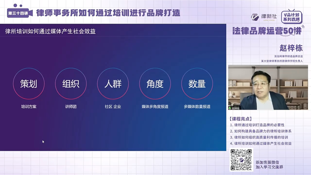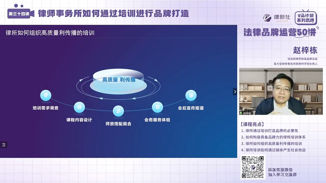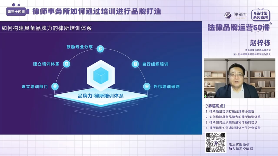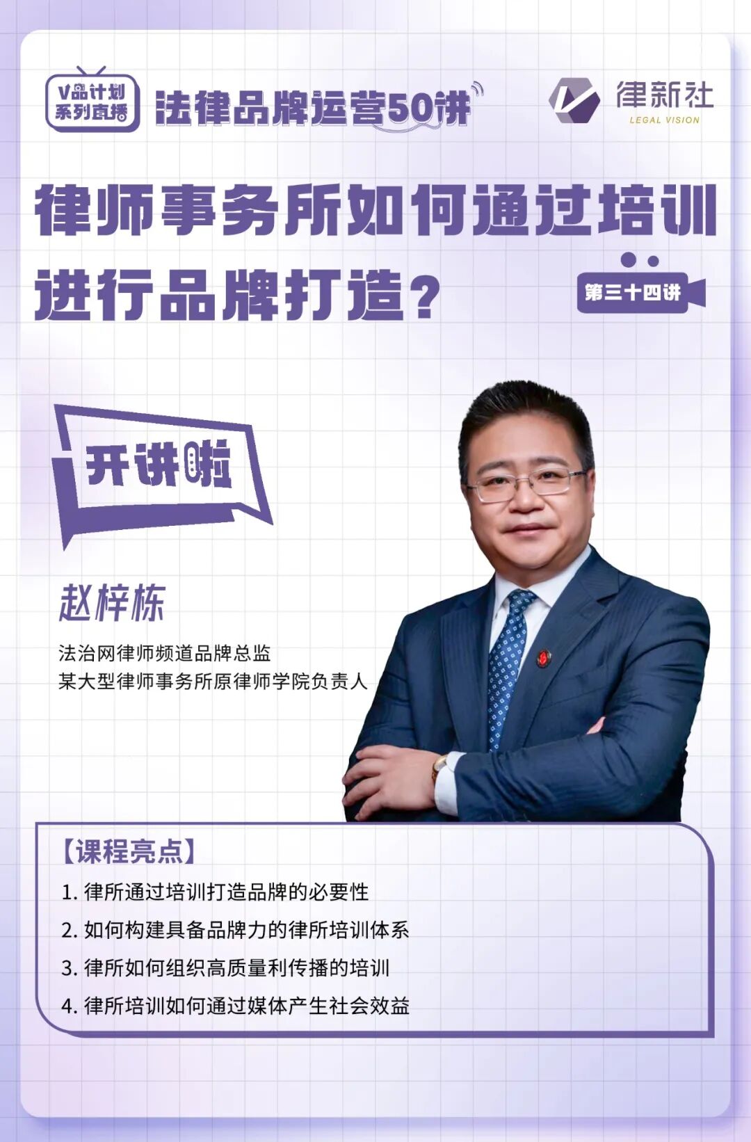 律新社“V品计划——法律品牌运营50讲”系列直播第三十四讲,邀请到法治网律师频道品牌总监赵梓栋做客“律新V品”直播间,与我们分享律师事务所如何通过培训进行品牌打造。 (以下为本讲核心内容精选)