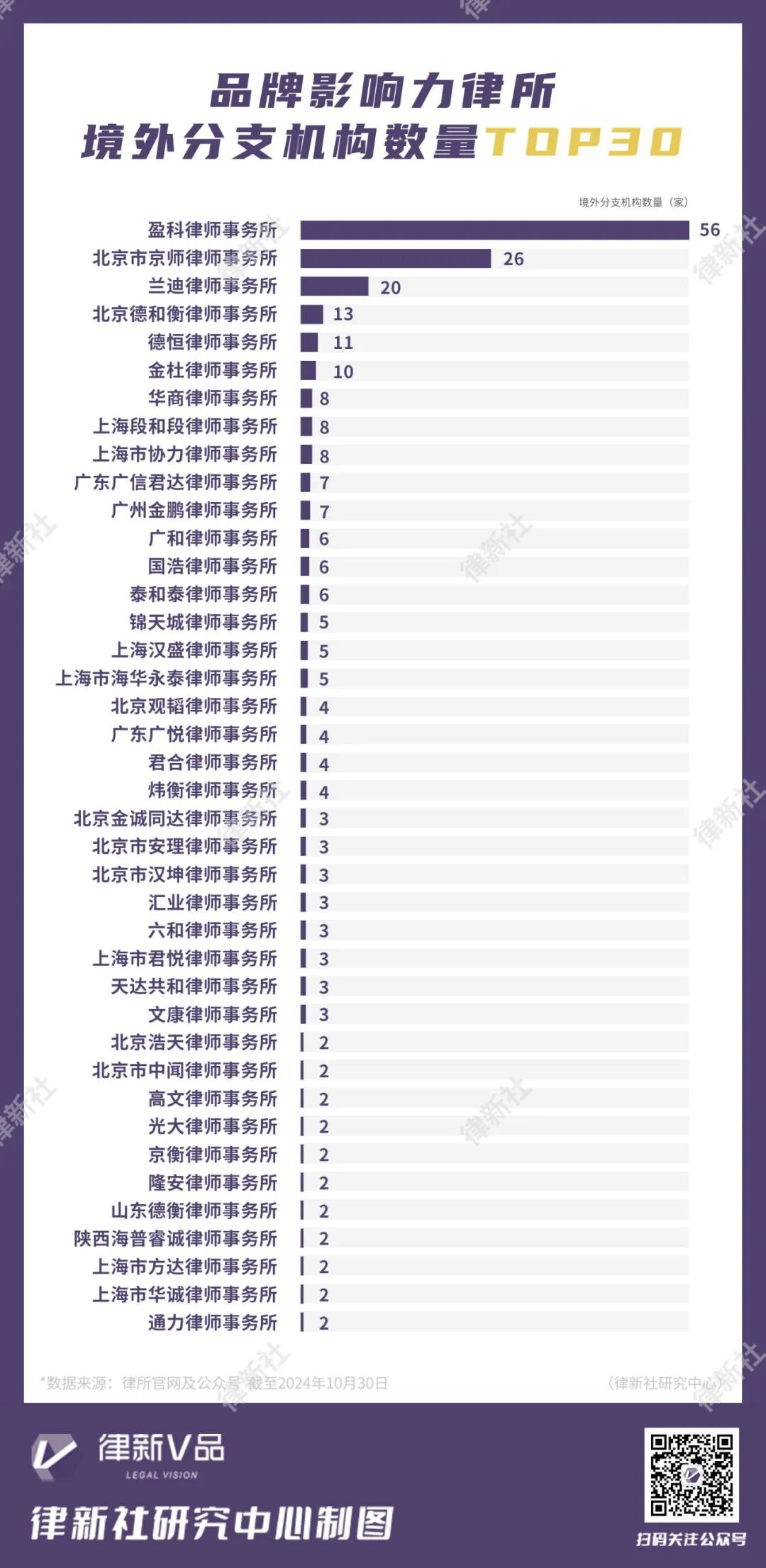 中国律所出海潮正在加速。据律新社研究中心统计,截至2024年10月30日,在“2023年度律新社卓越品牌影响力律所100佳”中,共有53家律所设立了境外分支机构,共设立境外分支机构282个。其中,境外分支机构数量进入TOP 30的律所共40家: