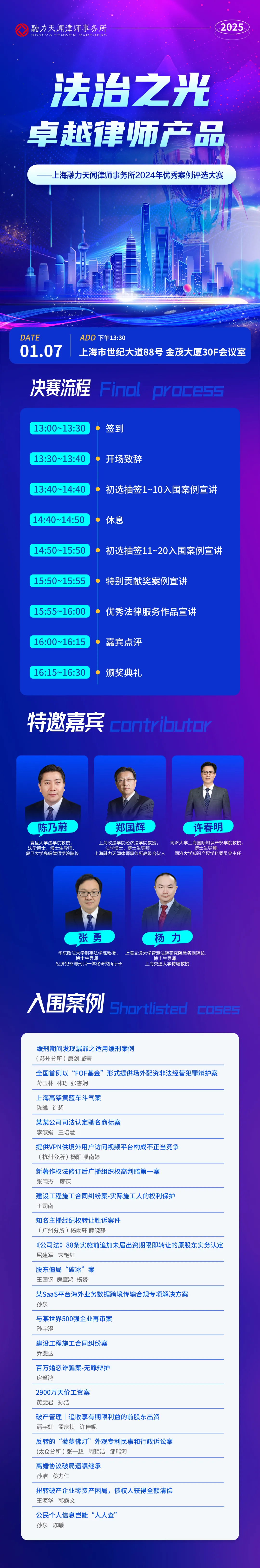 2025年1月7日下午13点30分,诚邀您来到金茂大厦30楼共享会议室共同见证这一法律界的盛事——上海融力天闻律师事务所“2024年优秀案例评选大赛”。