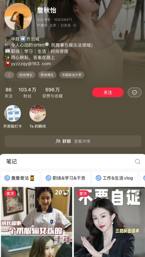 律师在小红书分享的内容分为职场碎碎念、生活情感碎碎念、一起学法律和职场时尚等多个板块,满足了不同粉丝群体的需求。