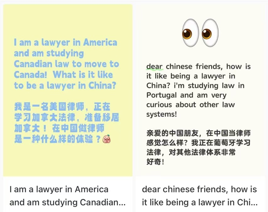 外国律师在小红书上的分享别具一格,为平台带来了别样的法律文化风景。他们将目光聚焦于中国独特的法律体系与法律实践,以一种充满好奇与探索的态度深入其中。他们好奇作为中国律师的体验,利用小红书的图片问问题功能与中国的网友进行交流。