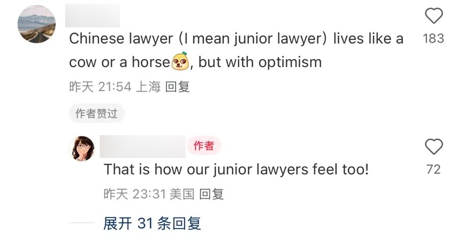 评论:中国初级律师像牛马一样,但是很乐观。 回复:我们国家的初级律师也是这样!