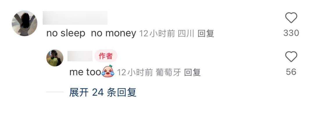 评论:没睡眠,没赚钱。 回复:我也是。