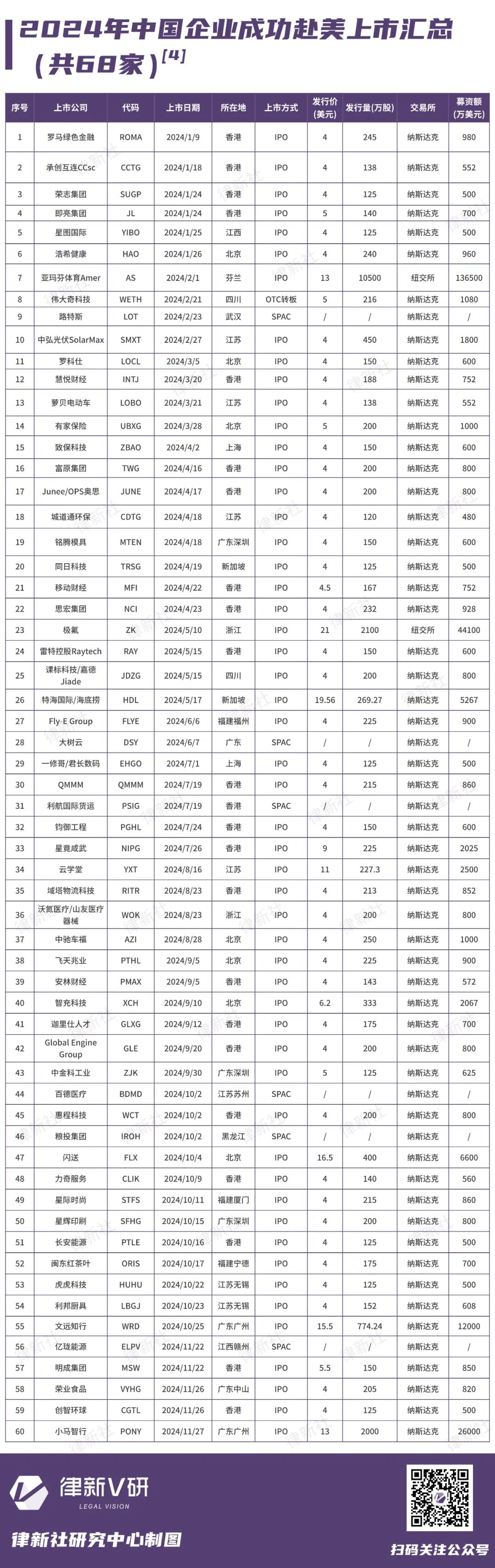 截至2024年12月31日,美国资本市场迎来了创纪录的一年,共有272家企业成功上市,累计募集资金达到407.36亿美元,这一数字不仅彰显了美国市场对全球企业的吸引力,也反映出其作为全球资本市场领头羊的地位。特别是,中国企业在美上市活动表现尤为活跃,全年共有68家中国企业成功登陆美国资本市场,累计募集资金27.58亿美元,相比2023年,无论是上市数量还是募资金额,均有显著增长,分别实现了84%和178%的涨幅。这一现象打破了2021年58家中国企业在美上市的记录,使2024年成为历史上中国企业赴美上市数量最多的一年。