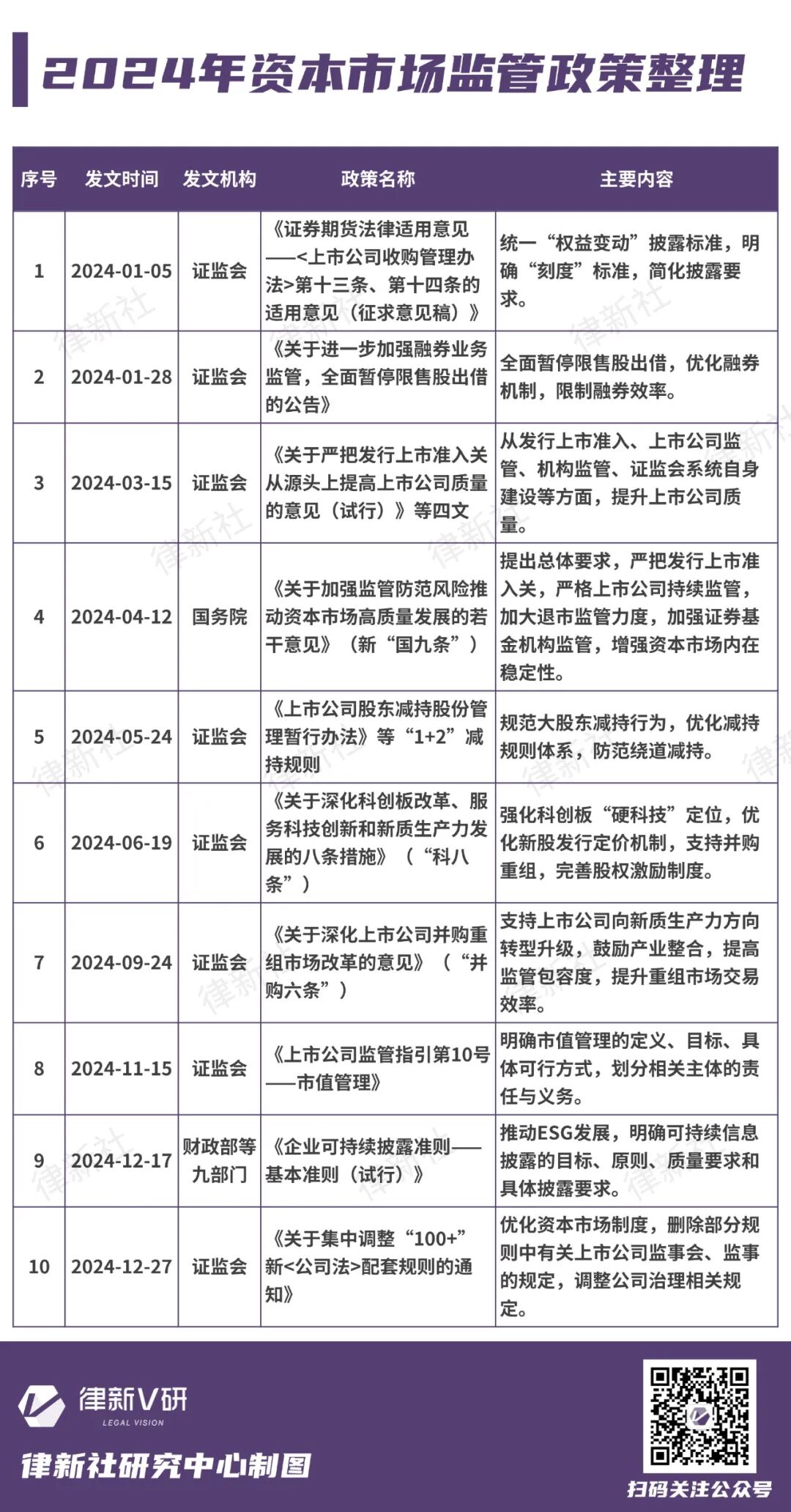 2024年中国资本市场在监管政策的引导下,经历了一系列深刻的变化。其中,新“国九条”和“1+N”政策体系的出台,在系统性重塑资本市场基础制度和监管底层逻辑的同时,推动了资本市场的高质量发展。政策具体措施包括严把发行上市准入关、严格上市公司持续监管、加大退市监管力度、加强证券基金机构监管、增强资本市场内在稳定性、推动中长期资金入市、深化改革开放等……据此,律新社研究中心以时间为线索,并考虑到发布机构,梳理了自2023年1月至2024年12月国务院、财政部及证监会等不同机构发布的政策文件。