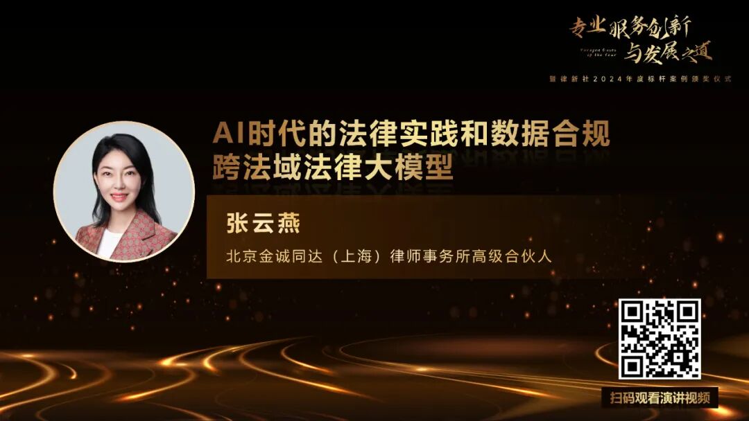 2025年2月23日,在“专业服务创新与发展论坛暨律新社2024年度标杆案例颁奖典礼”上,北京金诚同达(上海)律师事务所高级合伙人张云燕作“AI时代的法律实践和数据合规 跨法域法律大模型”主题演讲。她聚焦跨法域法律大模型与数据合规,带来了精彩的分享。张云燕律师的主题分享整理如下: