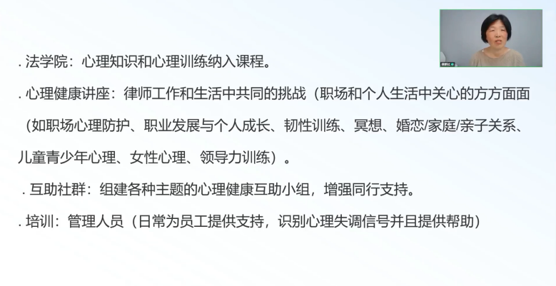 在具体可行的做法上,我认为法学院应该将心理知识和心理训练纳入课程体系,这是一种预防机制,类似于心理健康的“疫苗”,让未来的法律从业者在学习阶段就意识到心理健康的重要性,并掌握基本的自我防护方法。此外,国内律师群体对心理健康讲座的接受度较高,我们可以围绕律师工作和生活的特点,设计针对性的讲座,比如职场心理防护、韧性训练、冥想、婚恋家庭、亲子关系、女性心理健康、领导力训练等,让心理健康的理念更贴近律师的实际需求。