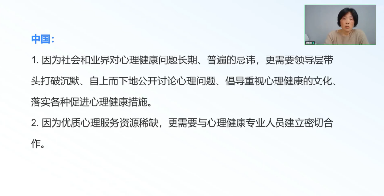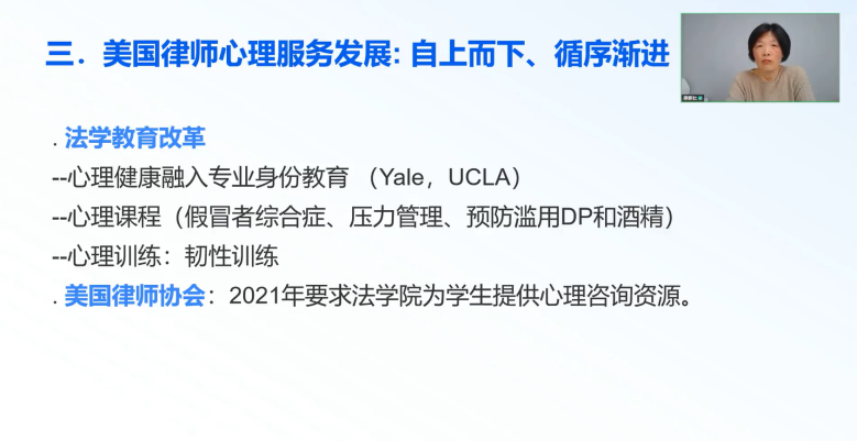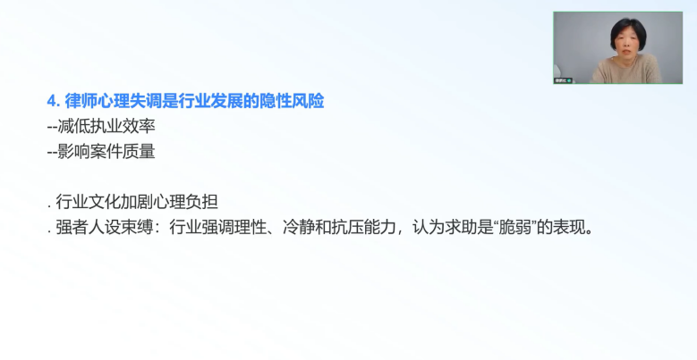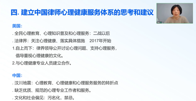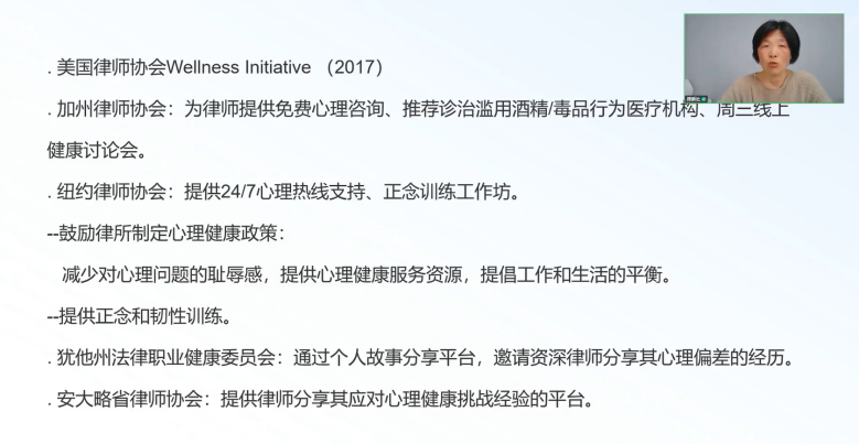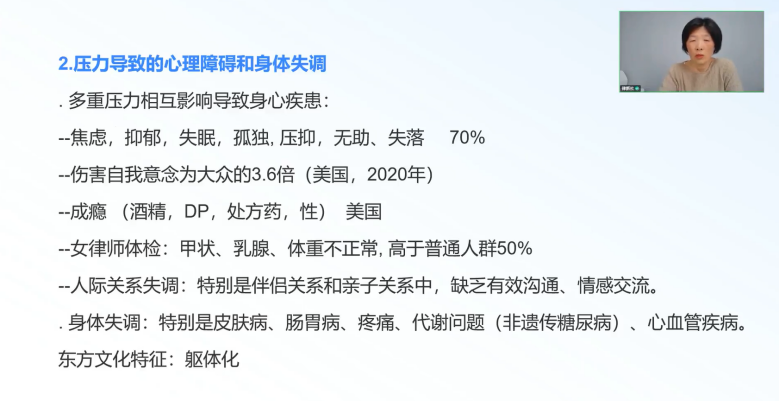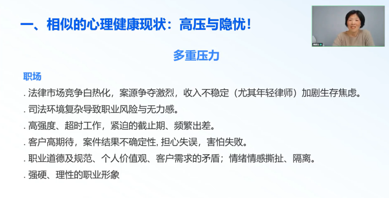 其实,中国和美国的律师在心理健康方面的情况是相似的,高压力、高焦虑,隐忧很多。