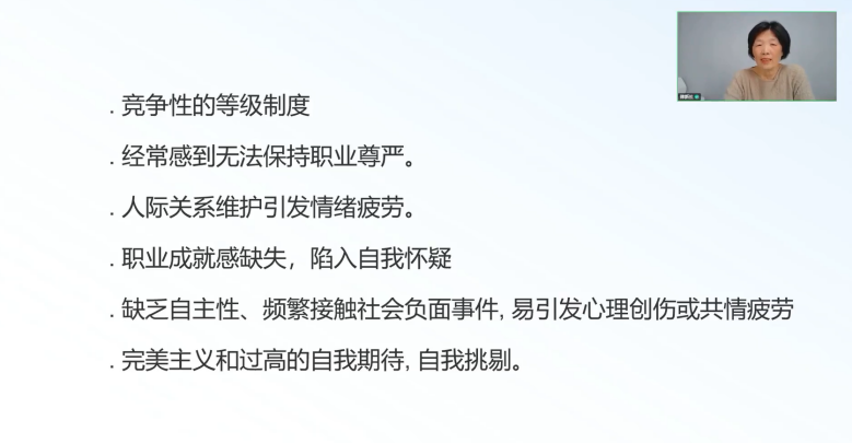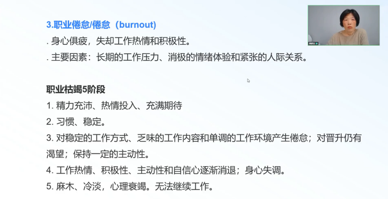 在东方文化里,人们往往对心理问题缺乏觉察,即使察觉到了,也不愿意说出口。长时间的压力最终会导致职业倦怠,也就是“burnout”。职业倦怠通常经历五个阶段:最初的热情投入,随后逐步感到倦怠,但仍存期待;之后主动性和自信心下降,身心失调;最终发展为冷漠麻木,失去继续工作的能力。