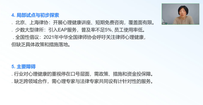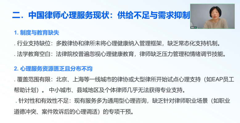 目前,只有一线城市的律协和大型律所开始试点心理支持,而中小城市的律师,尤其是个体律师,几乎无法获得专业的心理支持。即便在提供心理服务的地方,现有的资源也存在针对性和有效性不足的问题。现在大多数心理服务都是通用性的心理咨询,缺乏针对律师职业特点的专项干预。