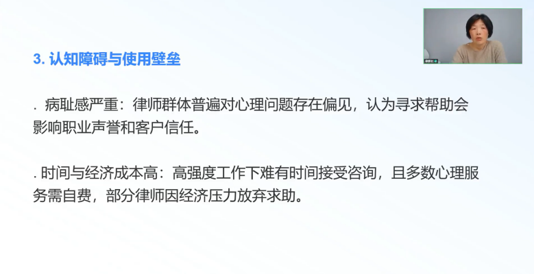 另一个核心问题是缺乏跨界合作。律师心理健康的解决方案,不能仅仅依靠心理学专家,而是需要心理学与法律行业的共同设计。律师是高智商、高逻辑思维的群体,如果心理服务不能精准击中他们的痛点,缺乏针对性,律师们会觉得“无关痛痒”,自然也就不愿意使用。